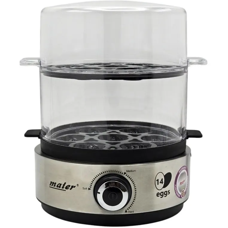 تخم مرغ پز برقی مایر مدل ۳۱۷؛ دستگاهی کوچک و سریع برای پخت همزمان چندین تخم مرغ به میزان دلخواه (عسلی تا کاملاً پخته).