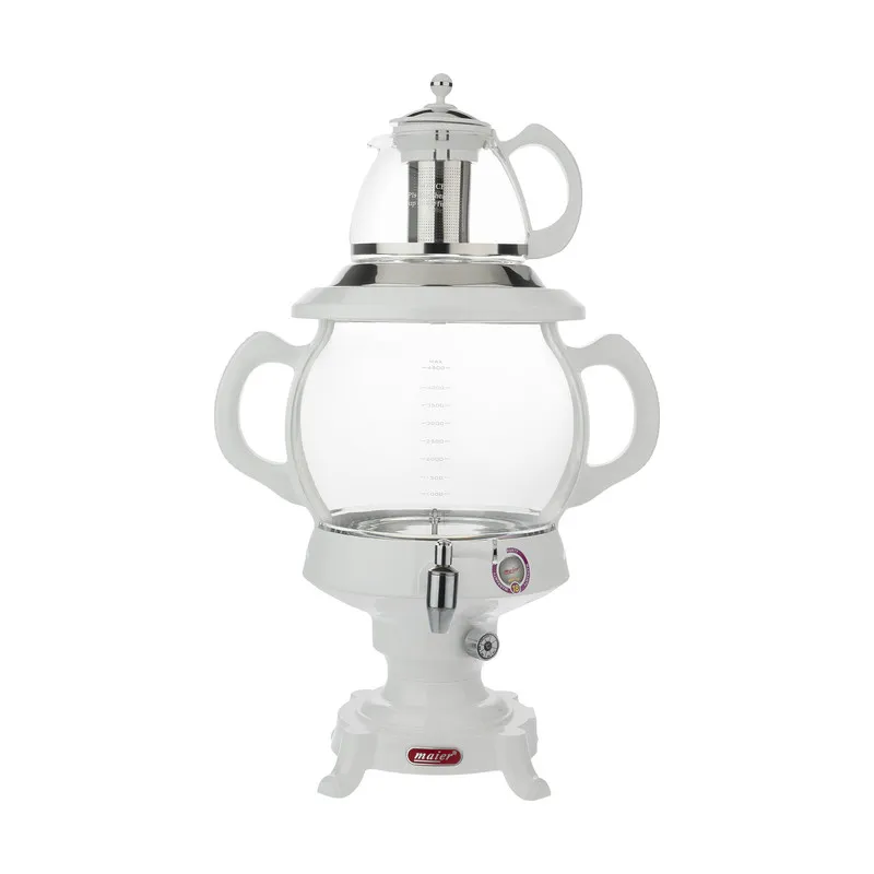 چای ساز و سماور برقی مایر ۳۸۷۷؛ با کتری شیشه‌ای و سینی گرم نگه‌دارنده، برای چای گرم و تازه.